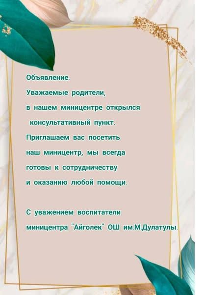 М. Дулатұлы атандағы ЖББМ жанындағы «Айгөлек» шағын орталығыныда «Консультациялық пунк» ашылғаны туралы ата-аналар группасына хабарландыру жіберілді.