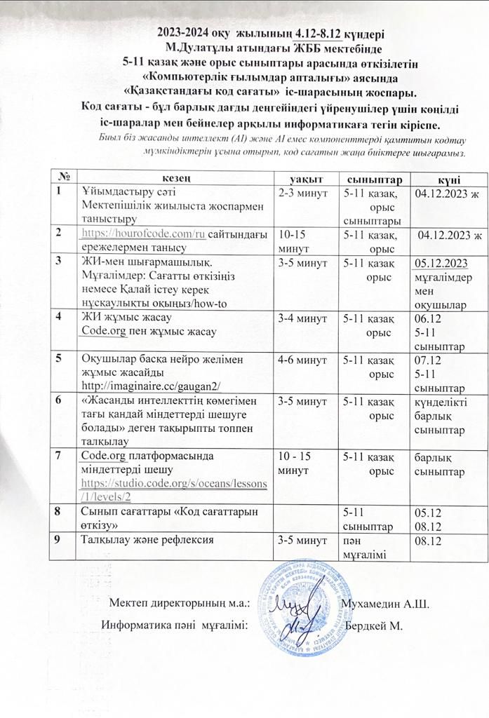 05.12.2023. М.Дулатұлы атындағы ЖББ мектебінде жоспарға сәйкес «Код сағаты» апталығы өтіп жатыр. "Код сағаты"- бұл барлық деңгейдегі оқушыларға арналған қызықты бейнеролик пен…