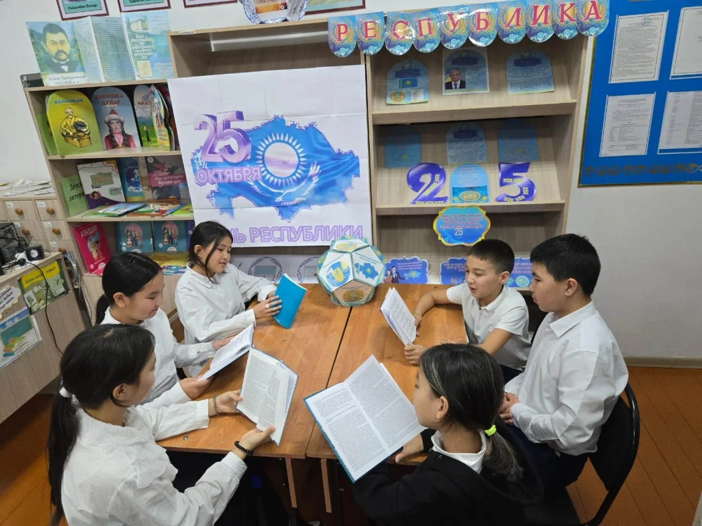 Мектеп кітапханашысы Жаманова А.Қ. Республика күніне орай 5-6-сынып оқушыларымен дөңгелек үстел өткізді және С.Сейфуллинге арналған көрме дайындады.