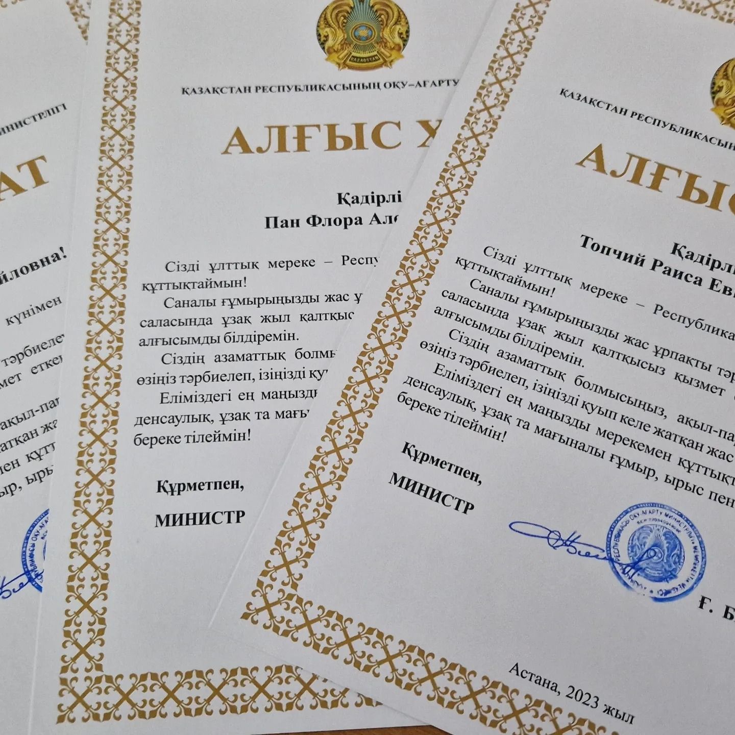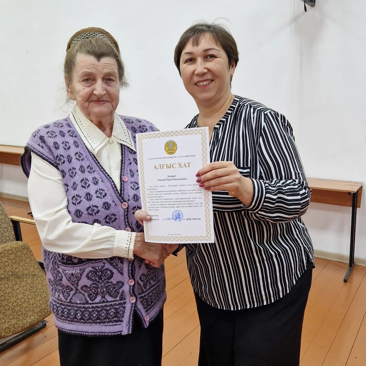 7 желтоқсан-Ақсақалдар және бата беру күніне орай мектебіміздің ардагер ұстаздары Топчий Р.Е., Пан Ф.А., Гузенко Г.М. қонаққа шақырылды. Оқу-ағарту министрінің алғыс хаттары табысталды.