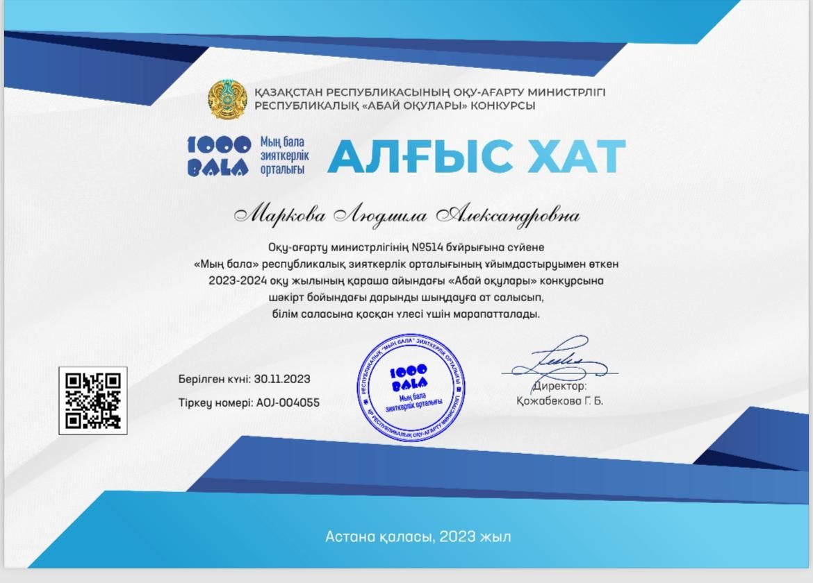 "Оқуға құштар мектеп" жобасы аясында 8 "А" сынып оқушылары Миллер Эрвин мен Куликов Артем "Абай оқулары" республикалық байқауына қатысып, сәйкесінше бірінші және үшінші…