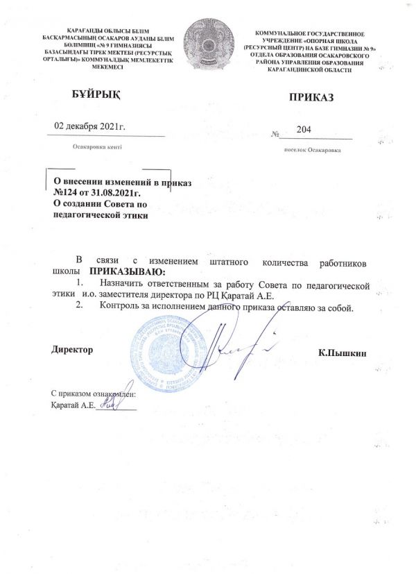Приказ №204 "О создании Совета по педагогической этике"