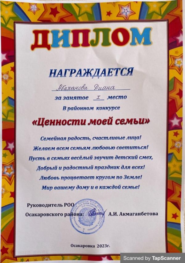 Ученица 7 класса КГУ "ОСШ №34" ОО Осакаровского района УО Карагандинской области Абаханова Диана Дархановна приняла участие в дистанционном районном конкурсе "Ценности моей семьи"…