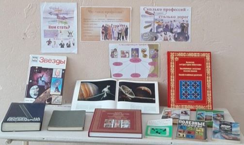 Библиотекарь Койбагарова В.В. вместе с учениками организовала оформление книжной выставки «Профессия на книжных страницах»