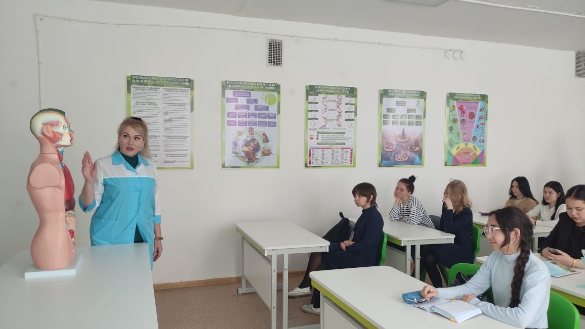 24 апреля 2024 года в КГУ "Опорная школа (ресурсный центр) имени Абая" ОО Осакаровского района УО Карагандинской области в рамках проекта «Шаг в медицину», медсестра школы Вайс…