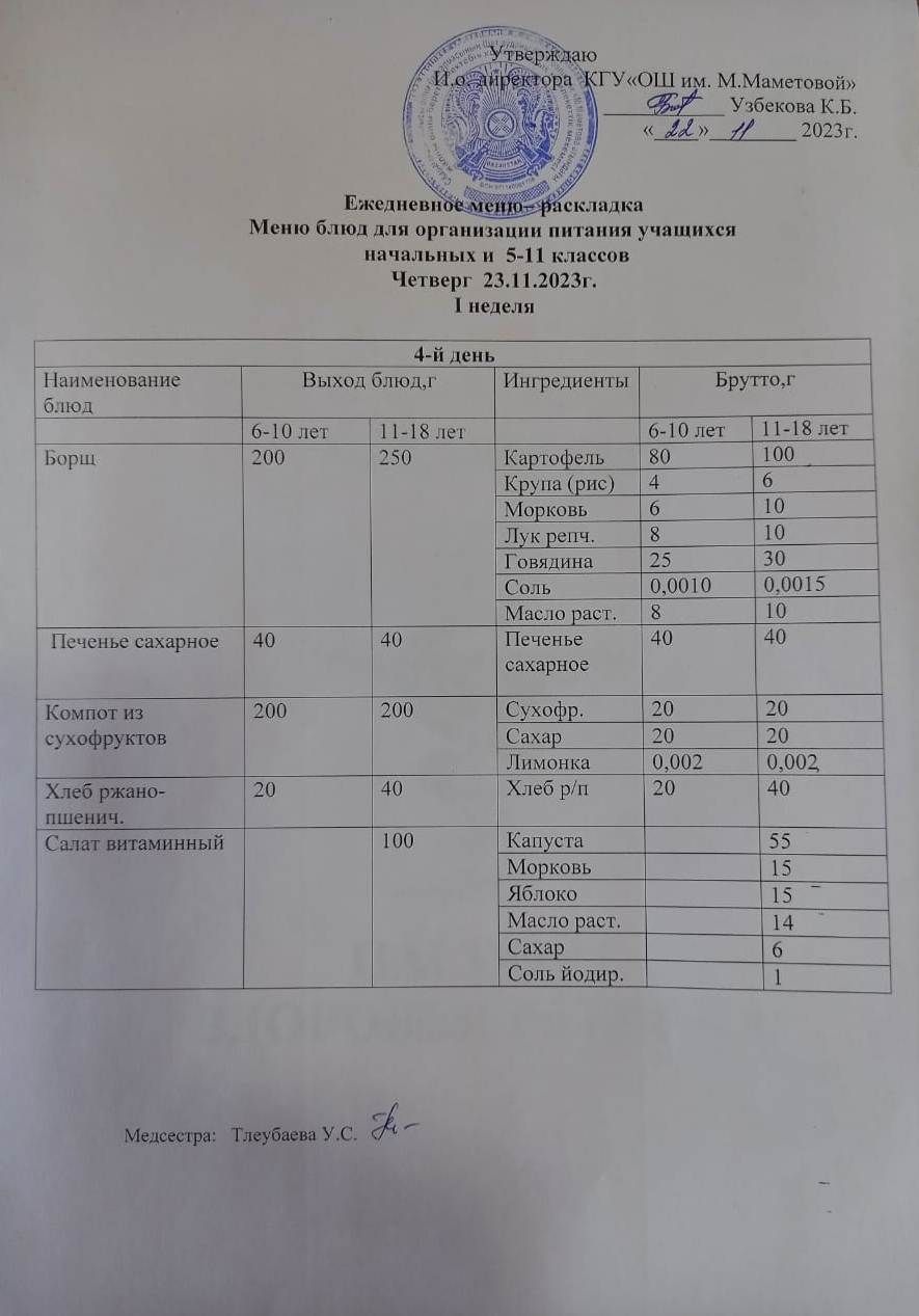 23.11.2023 БАСТАУЫШ СЫНЫПТАР МЕН 5 – 11 СЫНЫПТЫҢ ӘЛЕУМЕТТІК ОСАЛ ТОП ОҚУШЫЛАРЫНЫҢ ТЕГІН ТАМАҚТАНУЫН ҰЙЫМДАСТЫРУҒА АРНАЛҒАН АС МӘЗІРІ