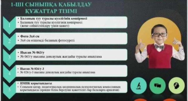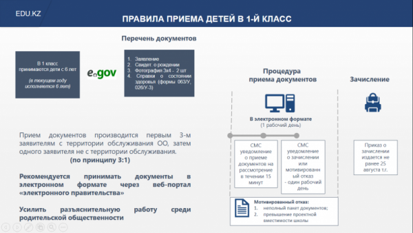 НАЗАР АУДАРЫҢЫЗ! Бірінші сыныпқа өтініштерді қабылдау ағымдағы жылдың 1 сәуірден бастап 1 тамызға дейін қолжетімді болады».