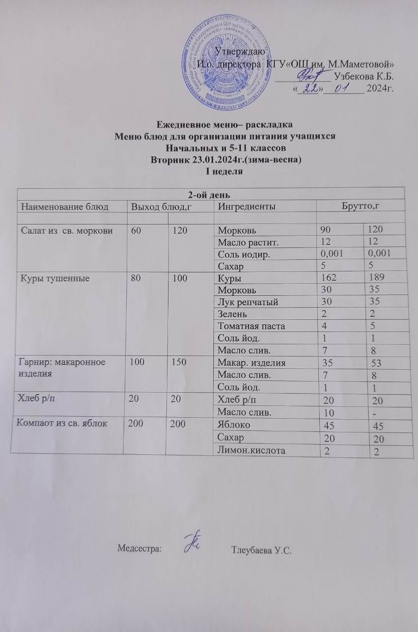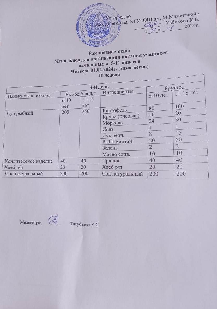 01.02.2024 КҮНІНЕ БАСТАУЫШ СЫНЫПТАР МЕН 5 – 11 СЫНЫПТЫҢ ӘЛЕУМЕТТІК ОСАЛ ТОП ОҚУШЫЛАРЫНЫҢ ТЕГІН ТАМАҚТАНУЫН ҰЙЫМДАСТЫРУҒА АРНАЛҒАН АС МӘЗІРІ