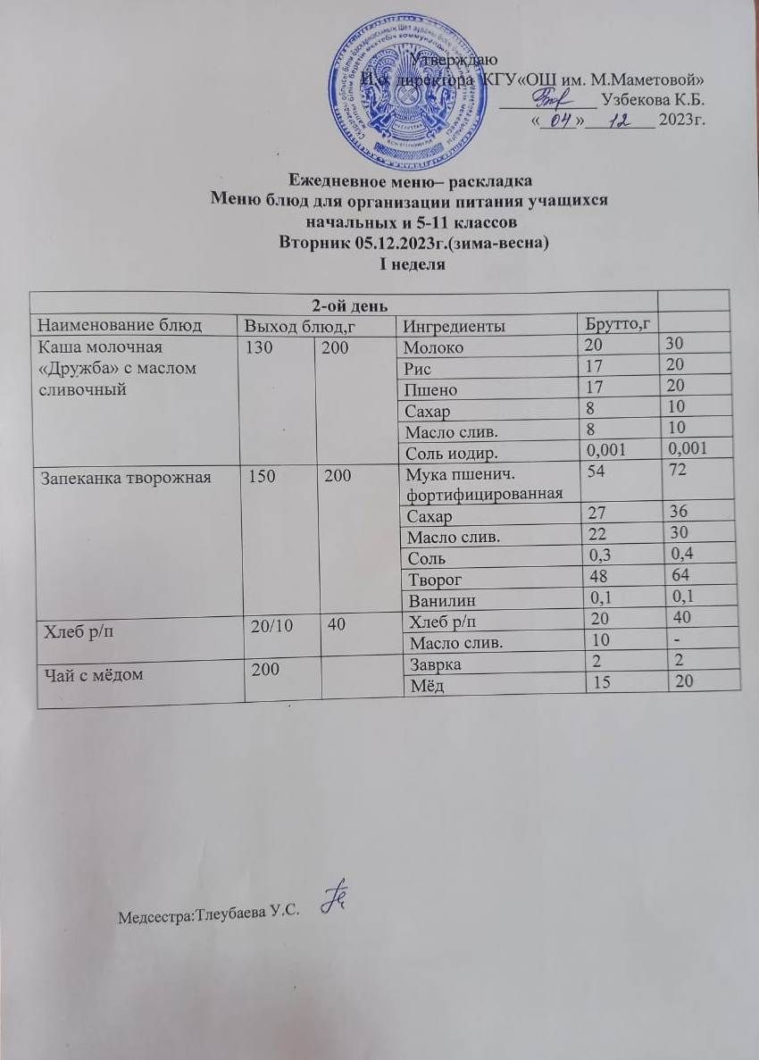 05.12.2023 БАСТАУЫШ СЫНЫПТАР МЕН 5 – 11 СЫНЫПТЫҢ ӘЛЕУМЕТТІК ОСАЛ ТОП ОҚУШЫЛАРЫНЫҢ ТЕГІН ТАМАҚТАНУЫН ҰЙЫМДАСТЫРУҒА АРНАЛҒАН АС МӘЗІРІ