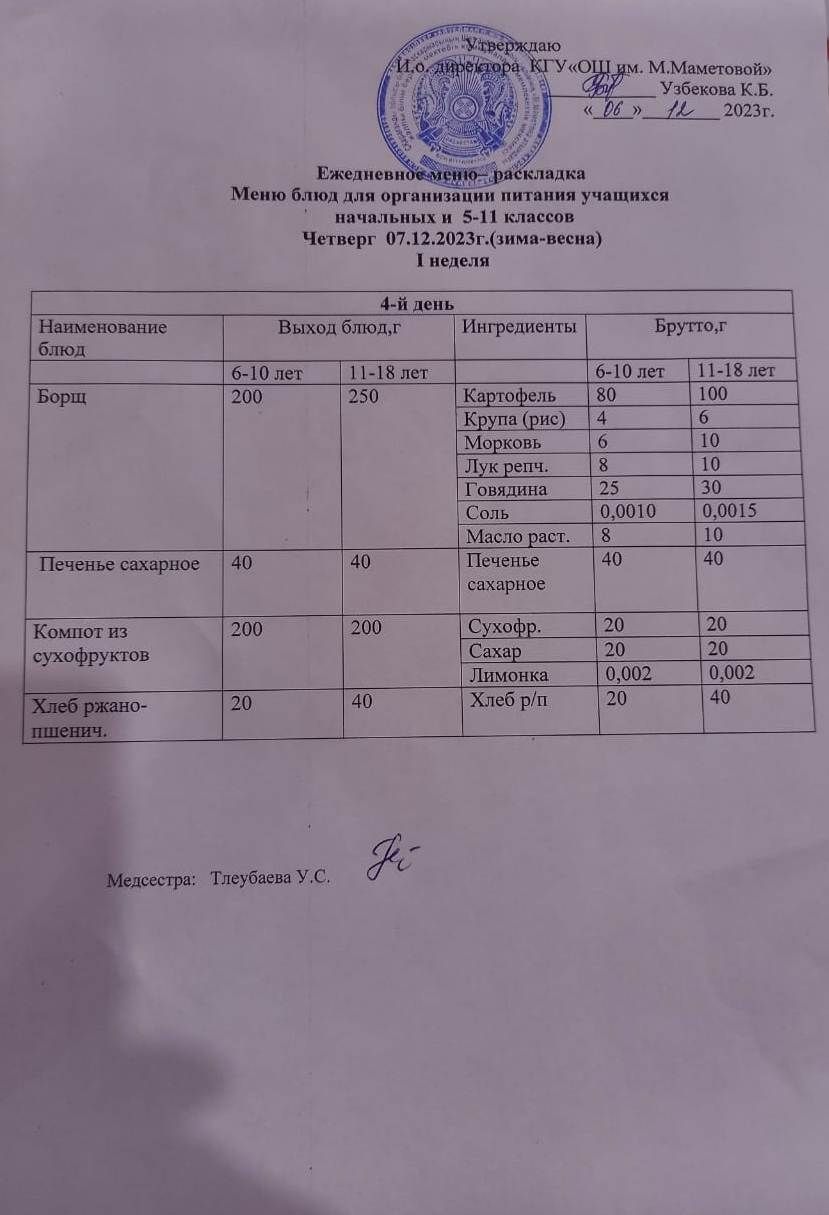 04.12.2023 БАСТАУЫШ СЫНЫПТАР МЕН 5 – 11 СЫНЫПТЫҢ ӘЛЕУМЕТТІК ОСАЛ ТОП ОҚУШЫЛАРЫНЫҢ ТЕГІН ТАМАҚТАНУЫН ҰЙЫМДАСТЫРУҒА АРНАЛҒАН АС МӘЗІРІ