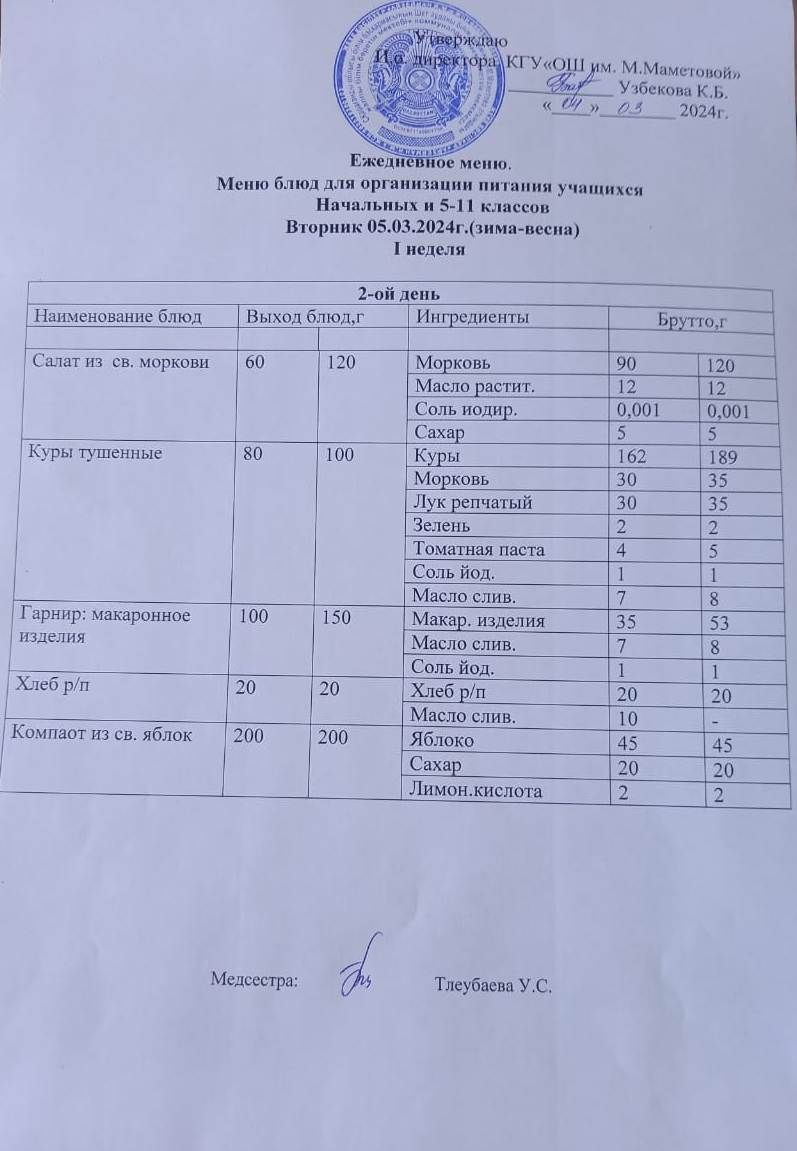 05.03.2024 БАСТАУЫШ СЫНЫПТАР МЕН 5 – 11 СЫНЫПТЫҢ ӘЛЕУМЕТТІК ОСАЛ ТОП ОҚУШЫЛАРЫНЫҢ ТЕГІН ТАМАҚТАНУЫН ҰЙЫМДАСТЫРУҒА АРНАЛҒАН АС МӘЗІРІ