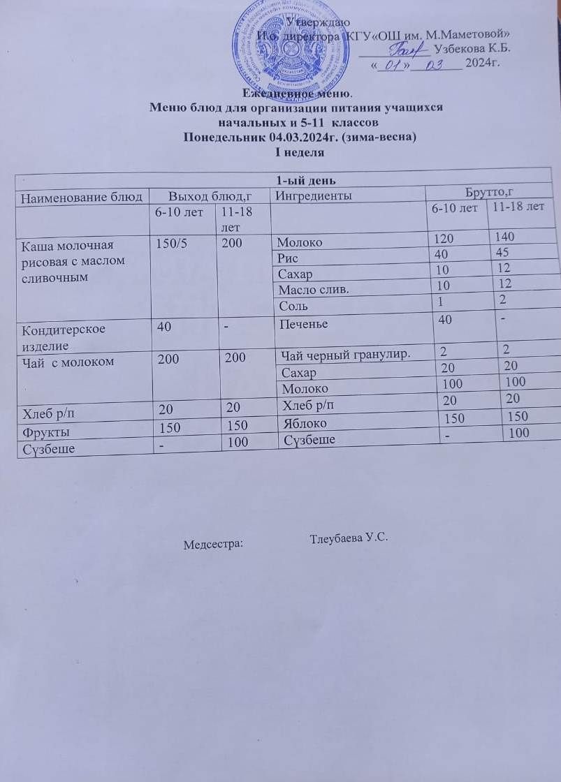 МЕНЮ ДЛЯ ОРГАНИЗАЦИИ БЕСПЛАТНОГО ПИТАНИЯ УЧАЩИХСЯ ДЛЯ НАЧАЛЬНЫХ КЛАССОВ И 5 - 11 КЛАССОВ СОЦИАЛЬНЫХ ДЕТЕЙ НА 04.03.2024
