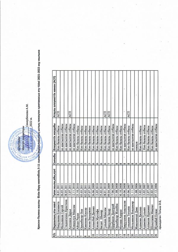 Ыстық тамақпен қамтылған 5-11 сынып оқушылары тізімі