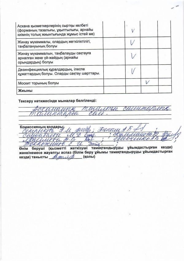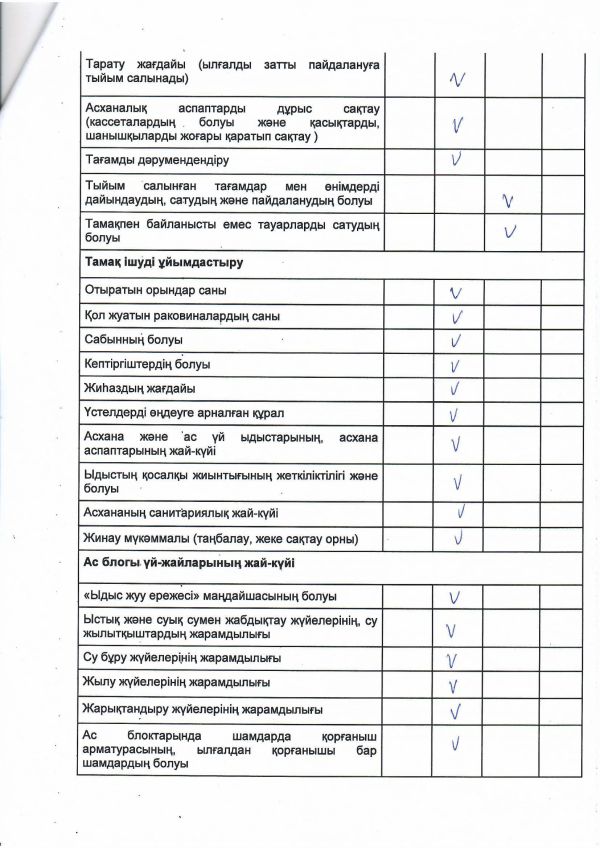 Тексеріс барысында асхана iшi, ас қоймасы таза, артық зат, иiс жоқ.