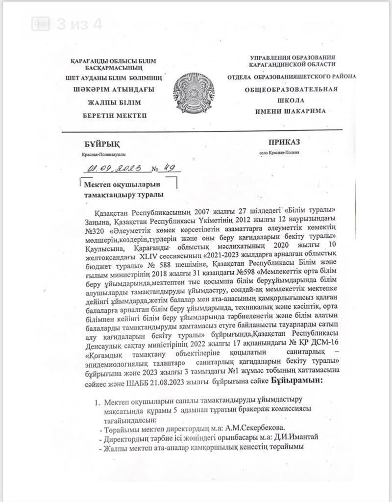 "Шәкәрім атындағы жалпы білім беру мектебінде" 2023-2024 оқу жылында мектеп оқушылары ыстық тамақпен қамтамасыз етілді.15.09.2023