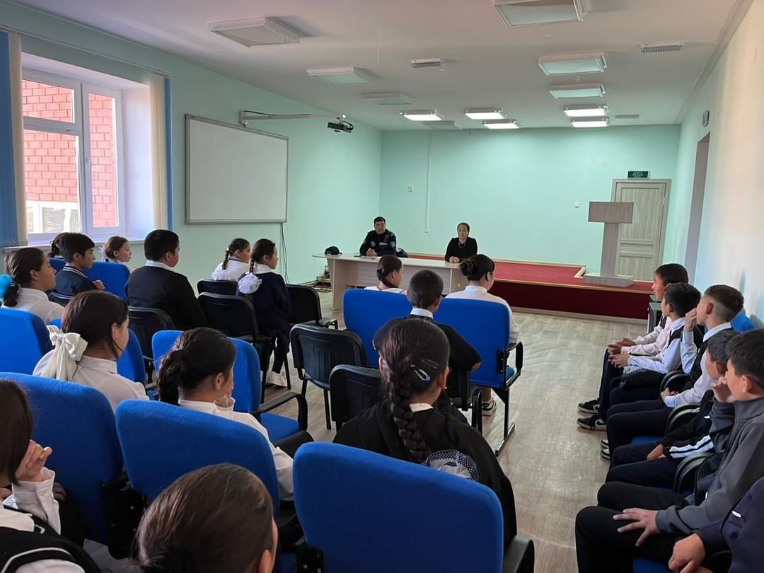 "С.Мұқамеджанов атындағы ЖББМ" КММ-інде кәмелетке толмағандар арасындағы құқық бұзушылықтың алдын алу"жұмыстары бойынша ауылымыздың учаскілік полиция инспекторы Шаризан Еркежанмен кез…