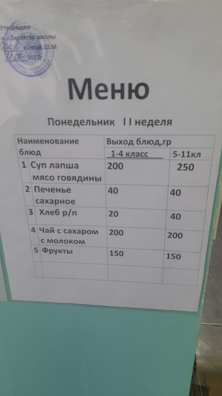 С.Мұқамеджанов мектебінің 2023-2024 оқу жылындағы 1аптаның жұма күнгі ас мәзірі