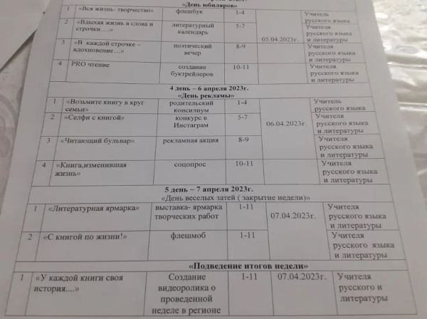 3-7.04.2023ж аралығында " ХХI век-век грамотного поколения!" атты сауаттылық апталығының жоспары саптық жиынында таныстырылды.