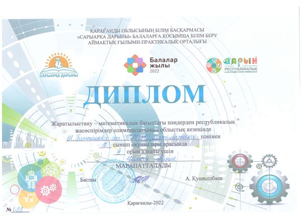 Мектебіміздің 7 "а" сынып оқушысы Үйлесін Айым Республикалық жасөспірімдер олимпиадасының облыстық кезеңіне қатысып, ІІІ орынға ие болды