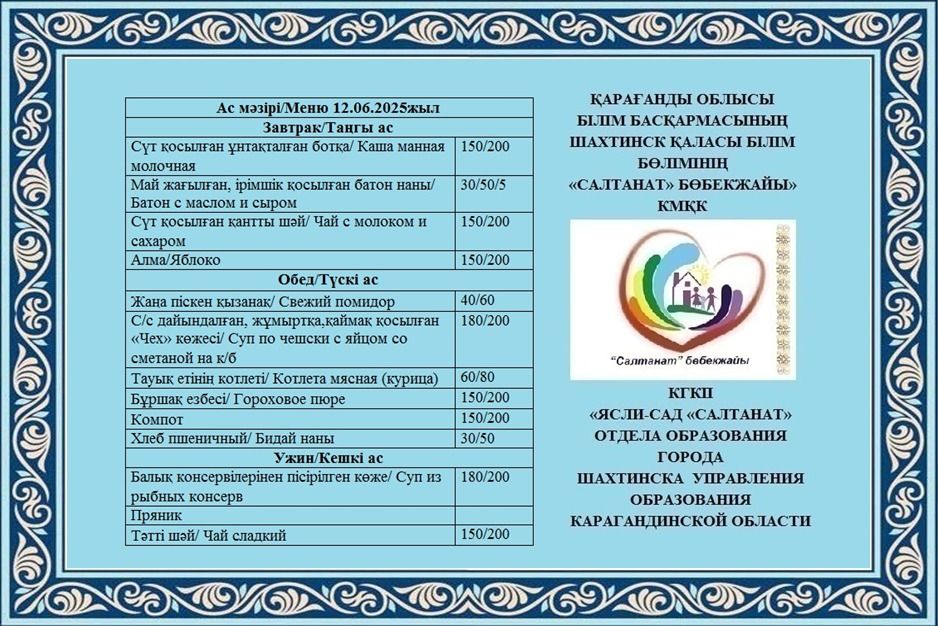 Сумма питания на 12.06.2025 составляет: на одного ребёнка до 3 лет - 689.24 тенге; на одного ребенка с 3 до 6 лет - 758.46 тенге