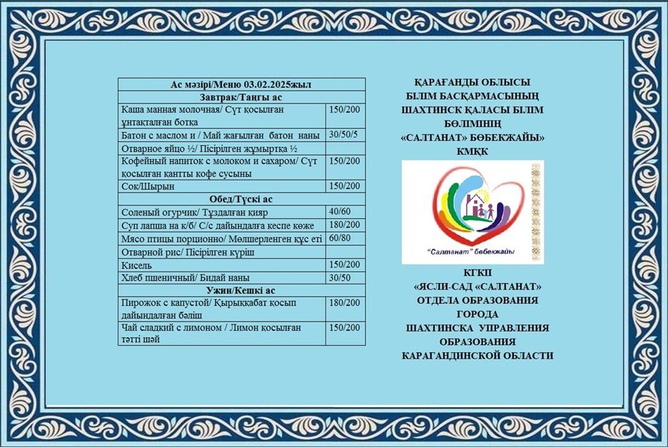 Сумма питания на 06.02.2025 составляет: на одного ребенка до 3 лет - 734.06 тенге; на одного ребенка с 3 до 6 лет - 853.89 тенге