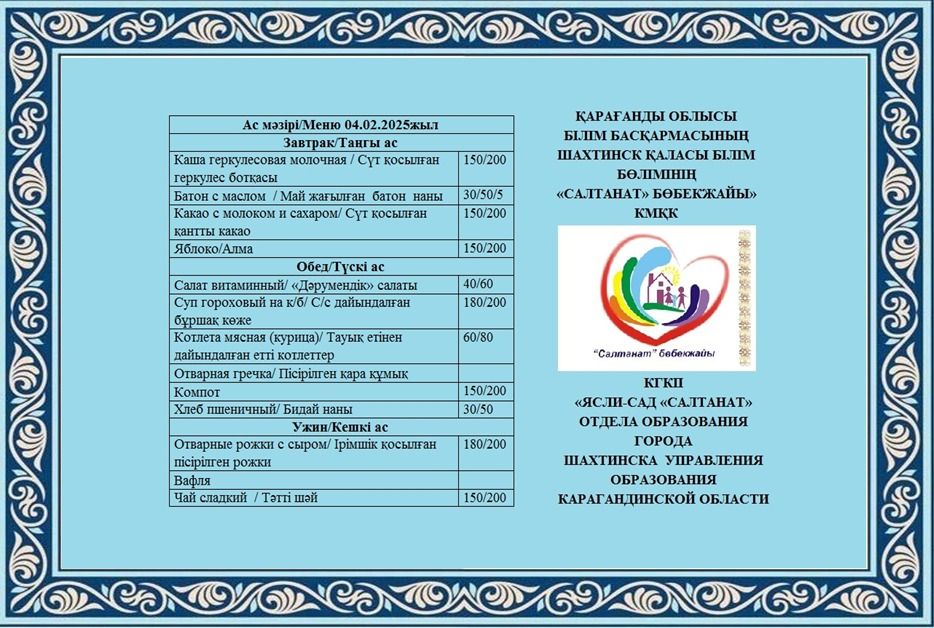 Сумма питания на 04.02.2025 составляет: на одного ребенка до 3 лет - 535.74 тенге; на одного ребенка с 3 до 6 лет - 639.44 тенге