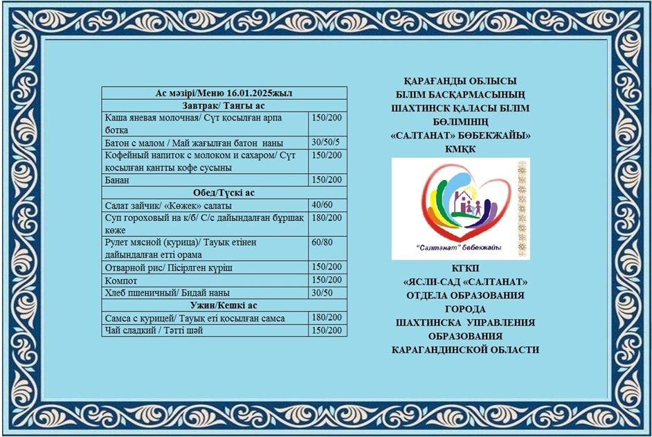 Сумма питания на 16.01.2025 составляет: на одного ребенка до 3 лет - 809.26 тенге; на одного ребенка с 3 до 6 лет - 890.84 тенге