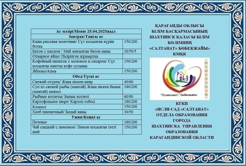 Сумма питания на 25.04.2025 составляет: на одного ребёнка до 3 лет - 769.03 тенге; на одного ребенка с 3 до 6 лет - 765.21 тенге