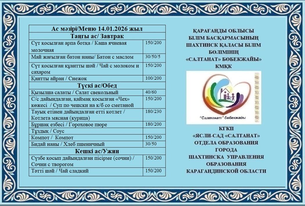 Сумма питания на 14.01.2026 составляет: на одного ребёнка до 3 лет - 720.76 тенге; на одного ребенка с 3 до 6 лет - 801.87 тенге