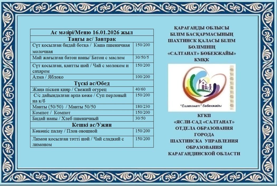 Сумма питания на 16.01.2026 составляет: на одного ребёнка до 3 лет - 748.30 тенге; на одного ребенка с 3 до 6 лет - 816.74 тенге