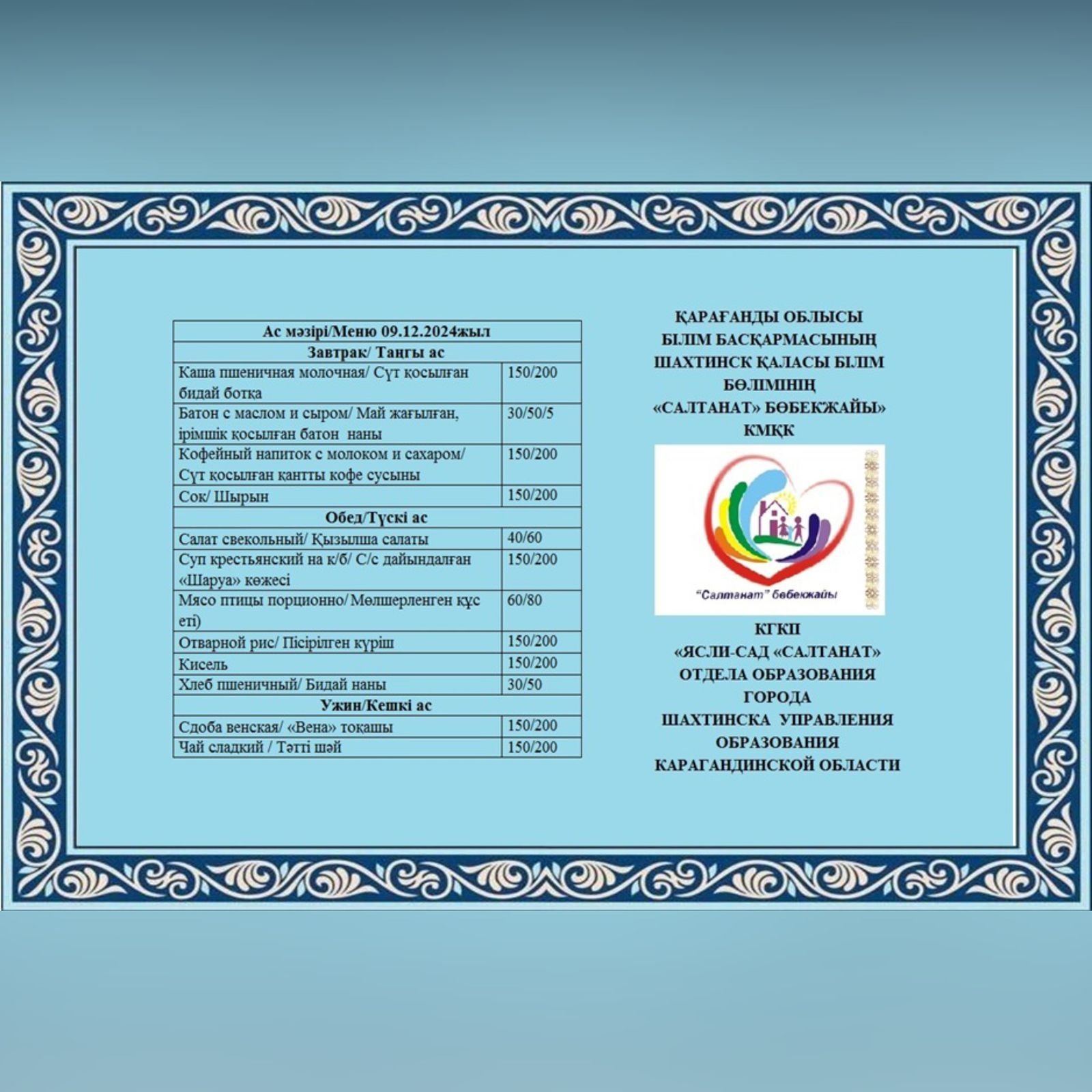 Сумма питания на 09.12.2024 составляет: на одного ребенка до 3 лет - 509.26 тенге; на одного ребенка с 3 до 6 лет - 638.85 тенге