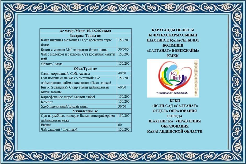 Салтанат бөбекжайы КМҚК 2024 жылдың 17 желтоқсанынан қарашасынан 2024 жылдың 30 желтоқсанына дейінгі болашақ екі апталық мәзірі №. 01-85