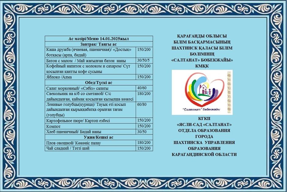 14.01.2025 жылға арналған тамақтану сомасы: 3 жасқа дейінгі бір балаға - 614.88 теңге; 3 жастан 6 жасқа дейінгі бір балаға - 725.10 теңге