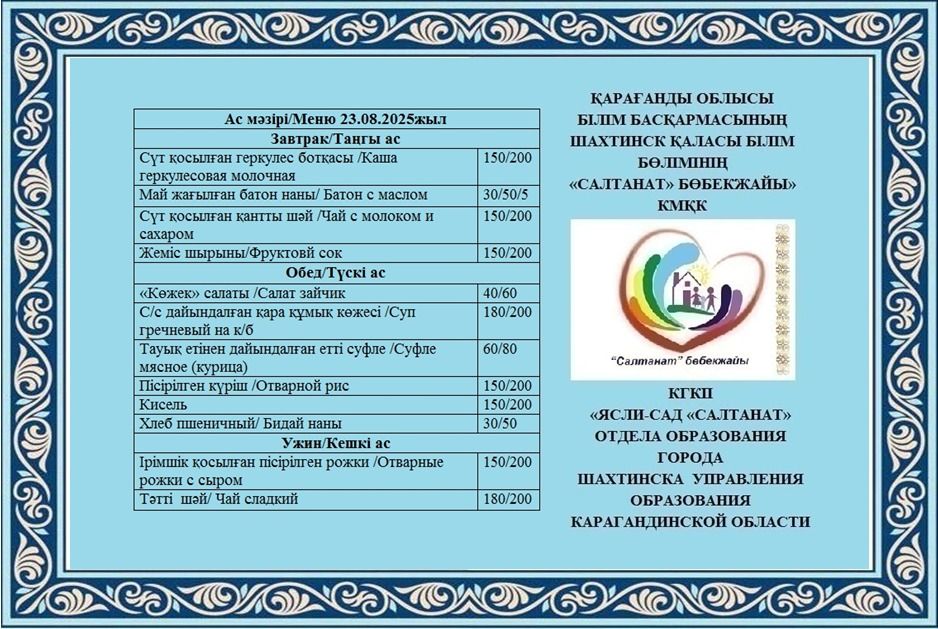 04.09.2025 жылға арналған тамақтану сомасы: 3 жасқа дейінгі бір балаға - 856.53 теңге; 3 жастан 6 жасқа дейінгі бір балаға - 940.14 теңге