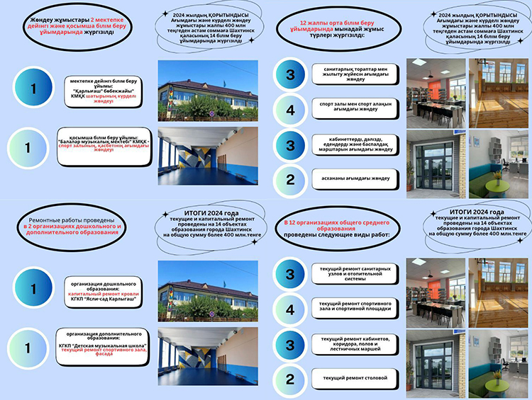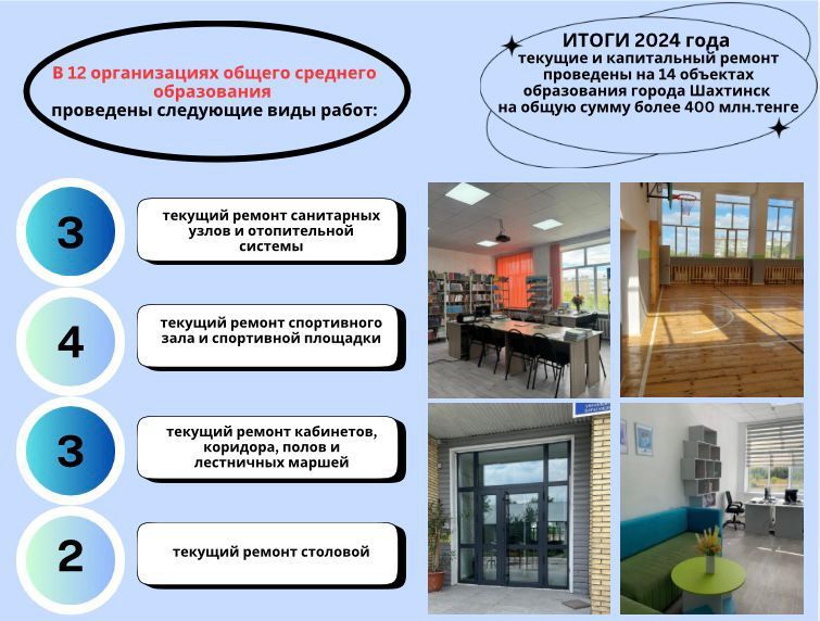 В 2024 году текущие и капитальный ремонт проведены на 14 объектах образования города Шахтинск на общую сумму более 400 млн.тенге.