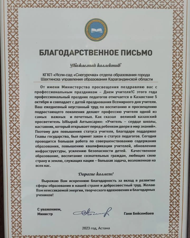 Благодарственное письмо от Министра просвещения Г.Бейсембаева коллективу детского сада.
