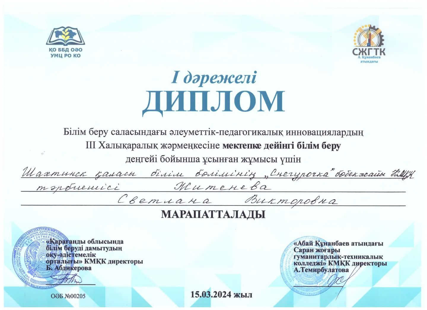 Поздравляем Житеневу Светлану Викторовну с занятым 1 местом на 3 Международной Ярмарке социально-педагогических инноваций в сфере образования, организованной Учебно-методическим центром Карагандинск…