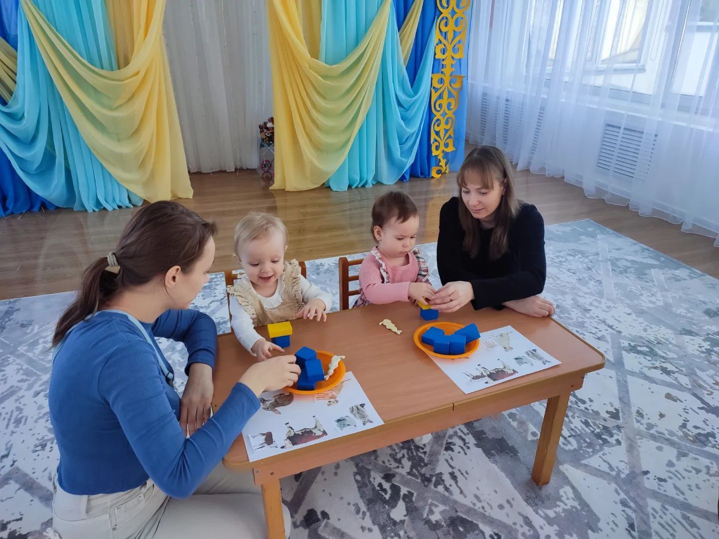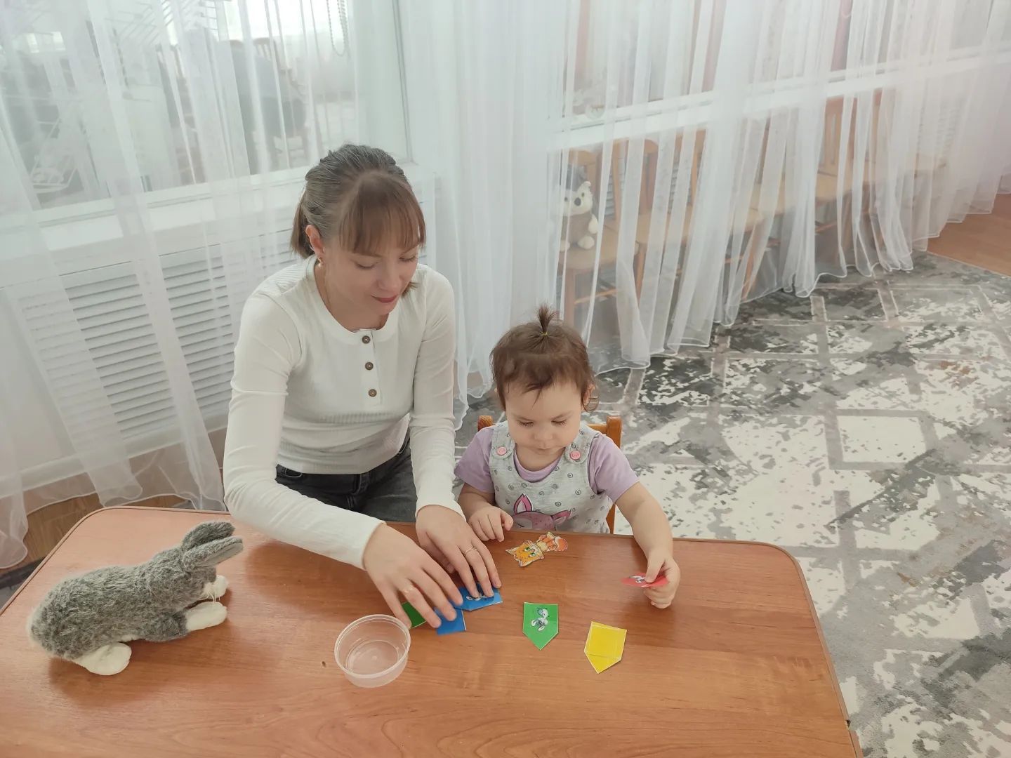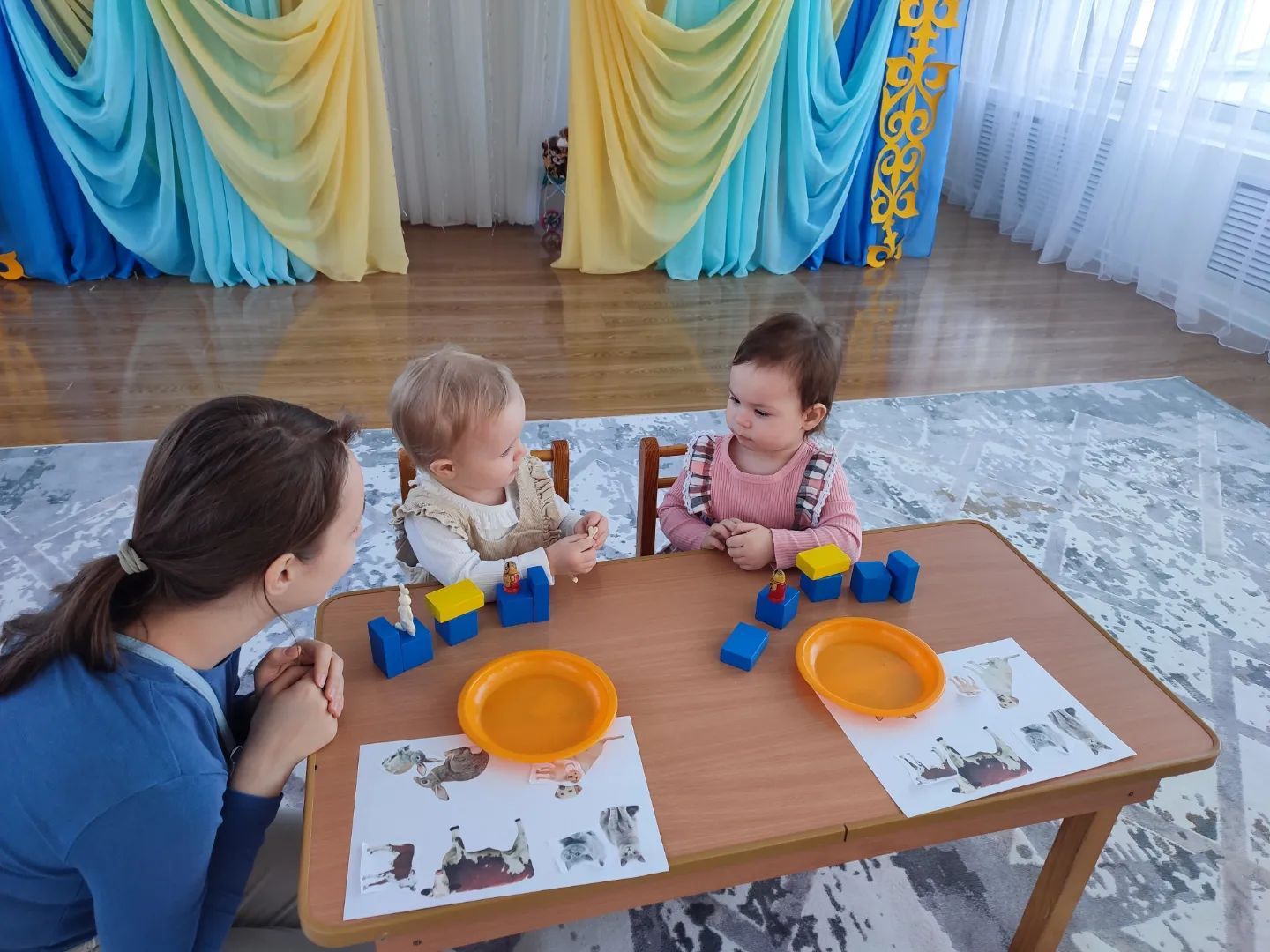 Тема: "Зайчик в гостях у матрешки". Вместе с Зайчиком научились стоить стул и стол из кубиков и кирпичиков, приготовили угощение для бе…
