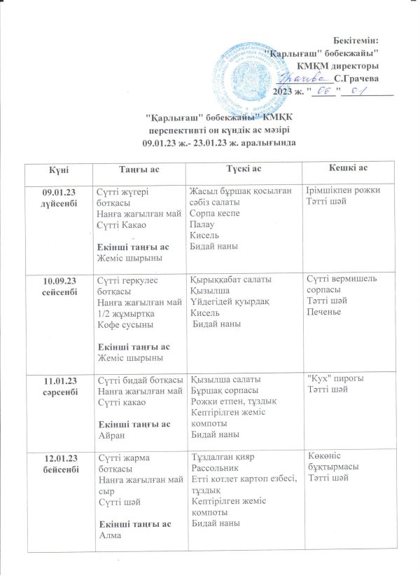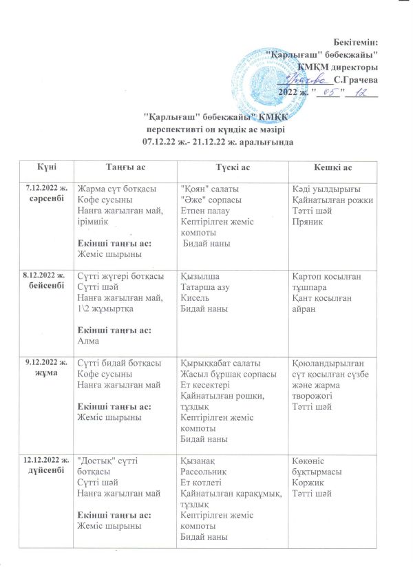 Перспективное десятидневное меню КГКП "Ясли- сад "Карлыгаш" с 26.10.2022 по 08.11.2022 года