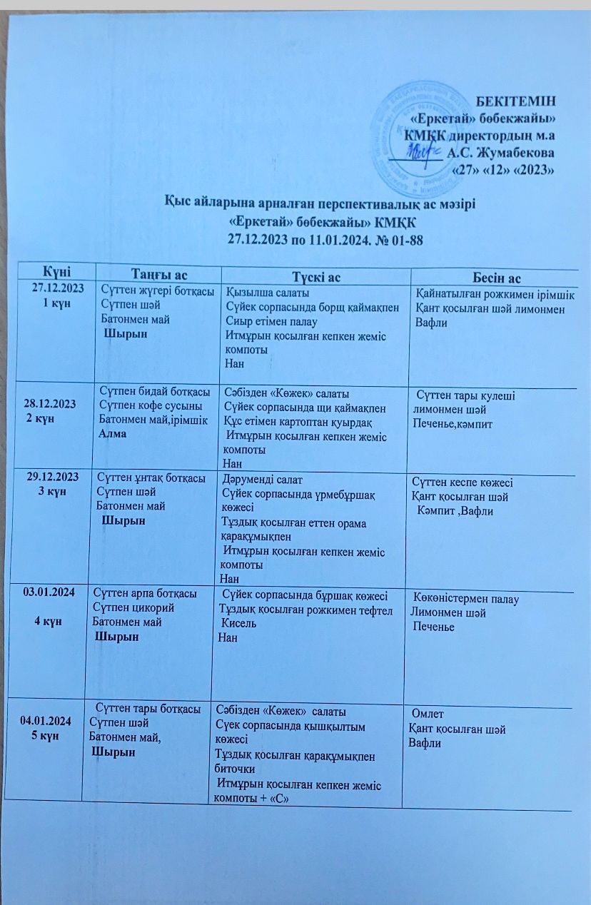 27.12.2023 ж 11.01.2024 жыл аралығына Перспективалық ас мәзірі: