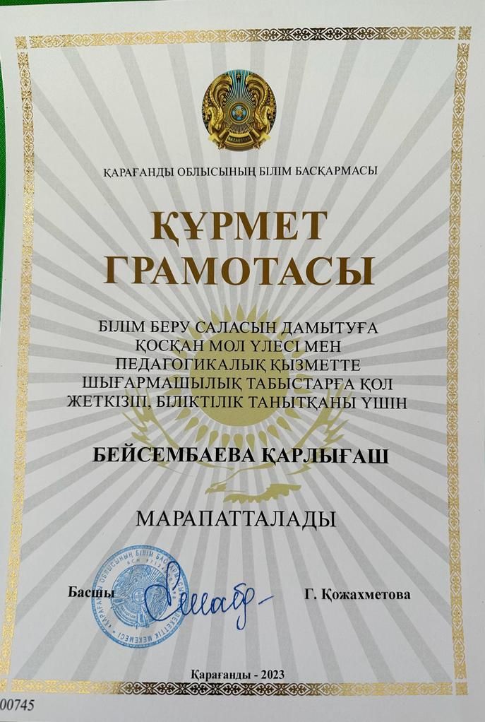 Ұстаздар мерекесіне орай ШАХТИНСК ҚАЛАСЫ БІЛІМ БӨЛІМІНІҢ Грамотасымен бөбекжайымыздың тәрбиешісі Жилкибаева Салтанат Қуатовна марапатталды.