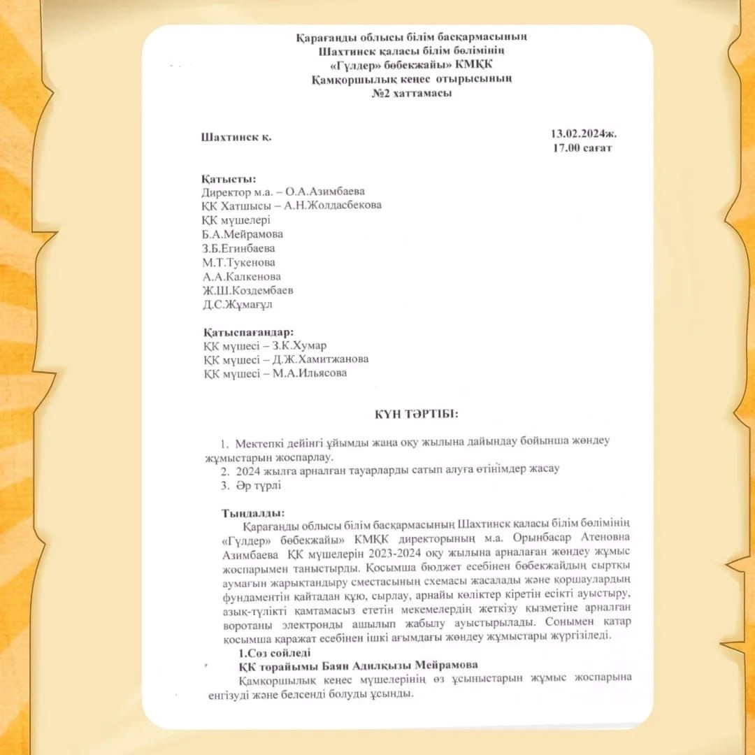 2024 жылдың 13 ақпанында өткен Қамқоршылық кеңестің №2 хаттамасы