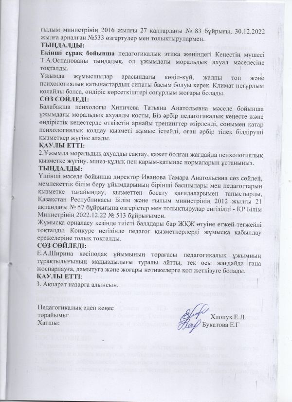 Приказ № 10 Об утверждение совета о педагогической этики