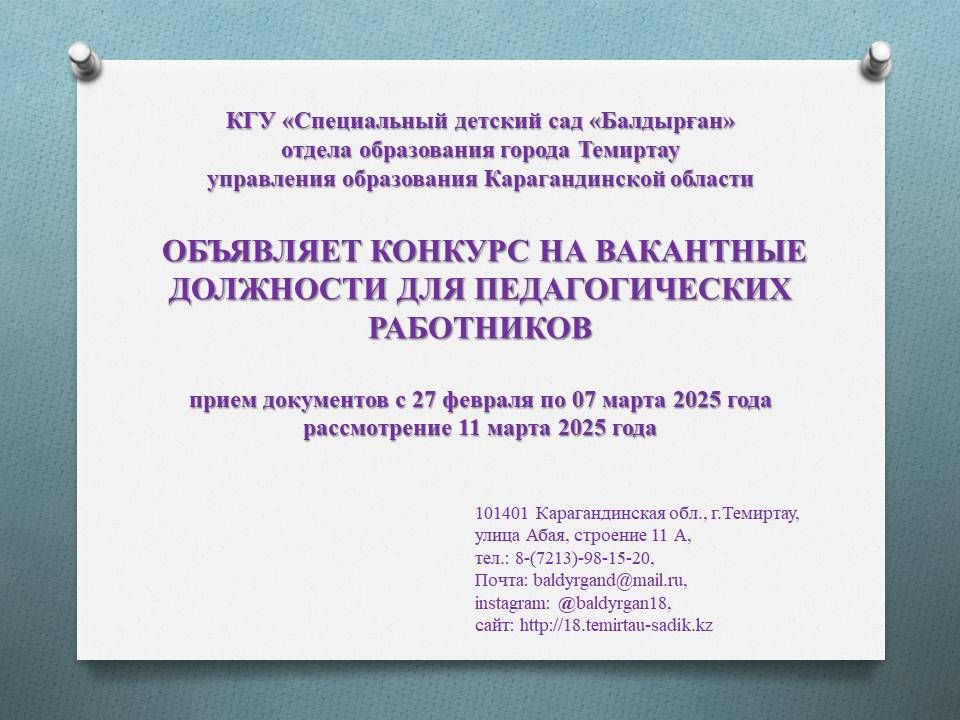 ОБЪЯВЛЯЕТСЯ КОНКУРС НА ВАКАНТНЫЕ ДОЛЖНОСТИ ДЛЯ ПЕДАГОГИЧЕСКИХ РАБОТНИКОВ