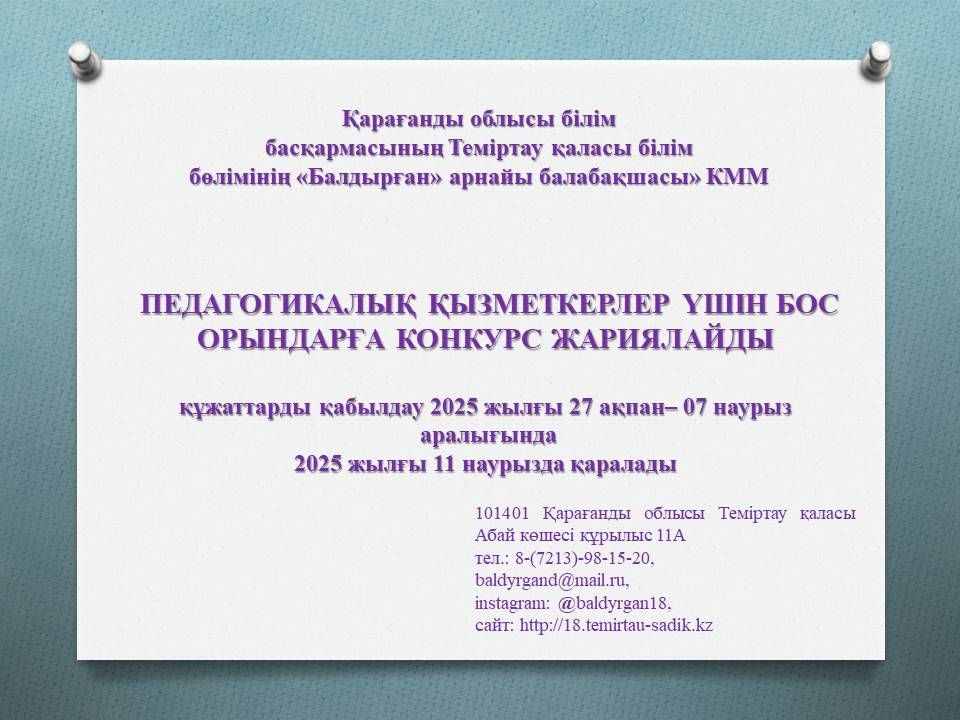 ПЕДАГОГИКАЛЫҚ ҚЫЗМЕТКЕРЛЕР ҮШІН БОС ОРЫНДАРҒА КОНКУРС ЖАРИЯЛАЙДЫ