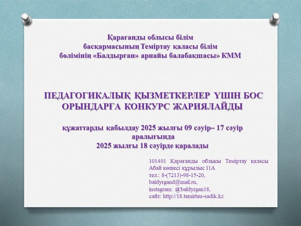 О создании комиссии для проведения конкурса на занятие вакантной и (или) временно вакантной должности педагогических работников КГУ «Специальный детский сад «Балдырған&raq…