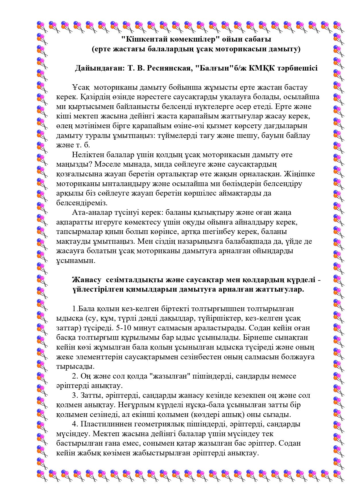 "Кішкентай көмекшілер" ойын сабағы (ерте жастағы балалардың ұсақ моторикасын дамыту)