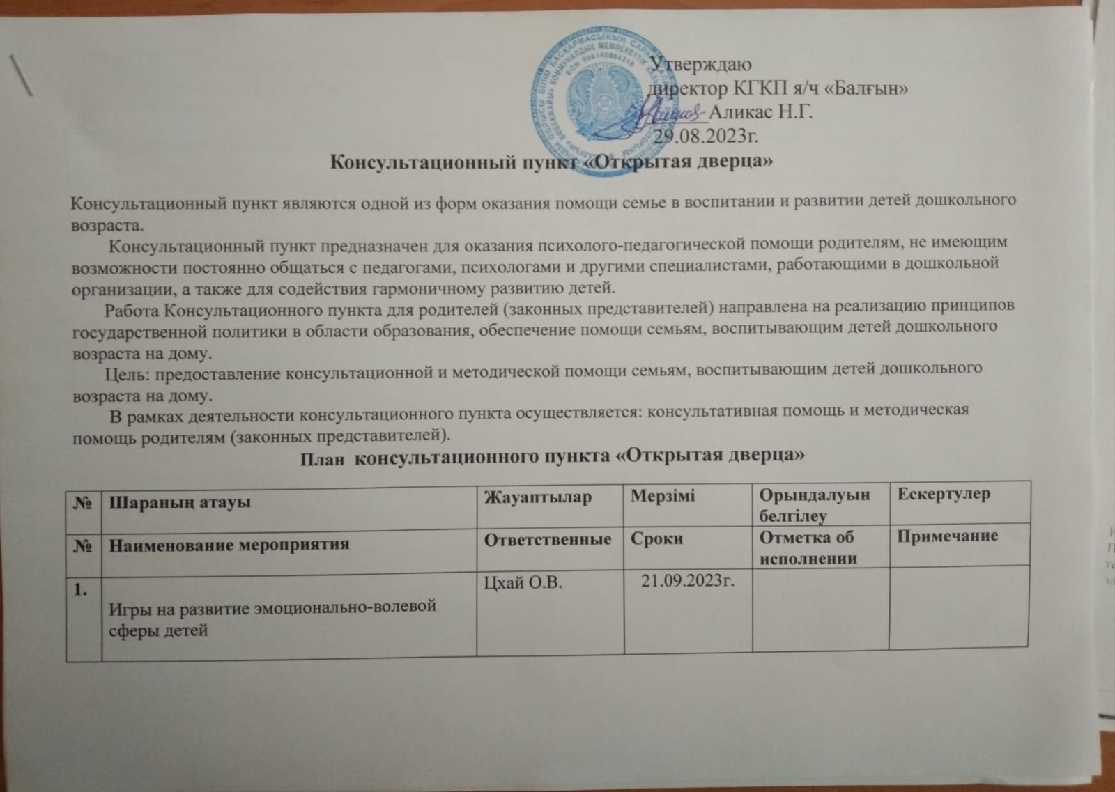 Мектепке дейінгі ұйымға бармайтық ата-анаралған Ашық есік кеңес беру пунктінің жылдық жоспарында мамандар мен педагогтармен консультациялар қарастырылған