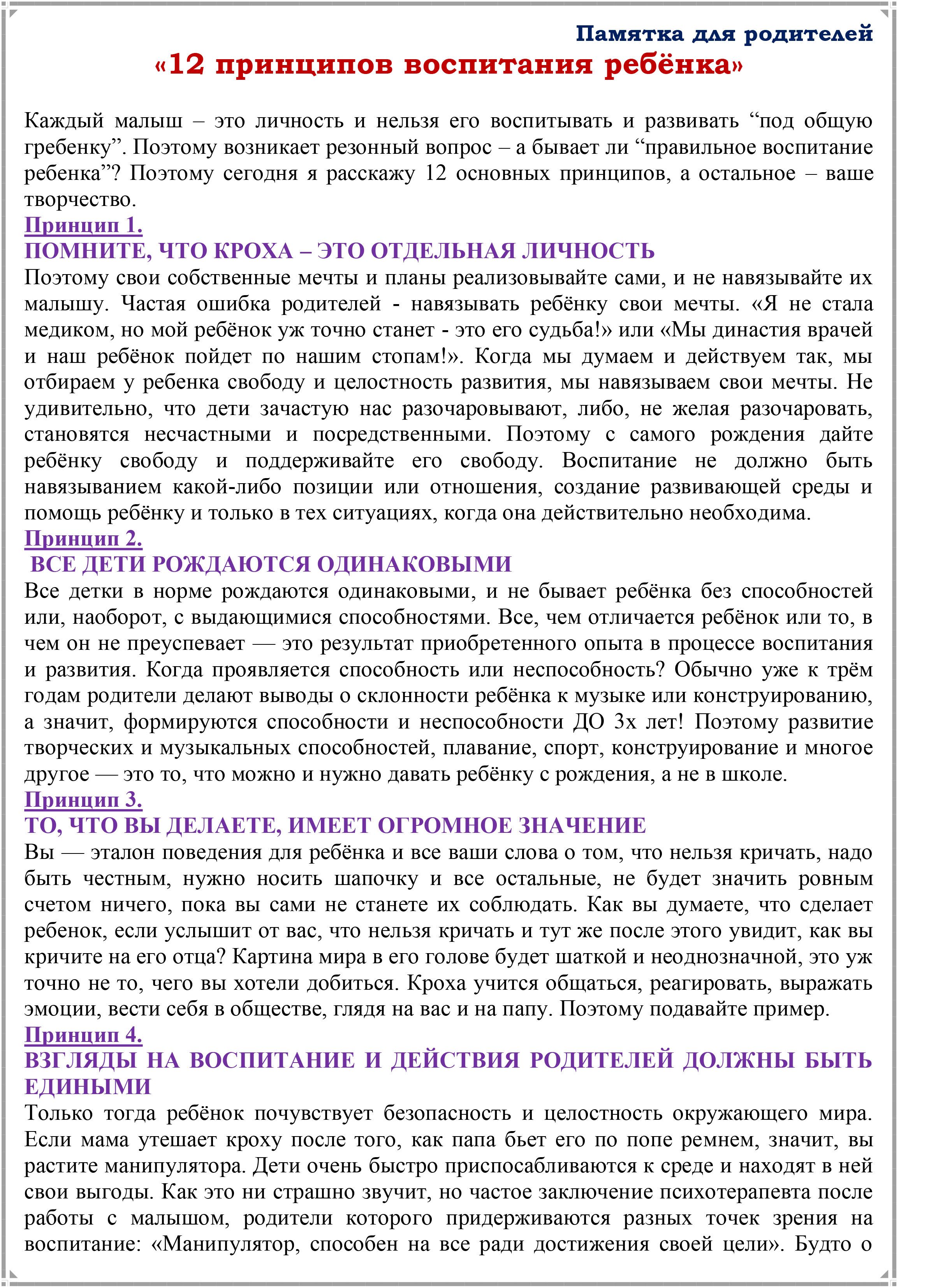 Памятка для родителей «12 принципов воспитания ребёнка»