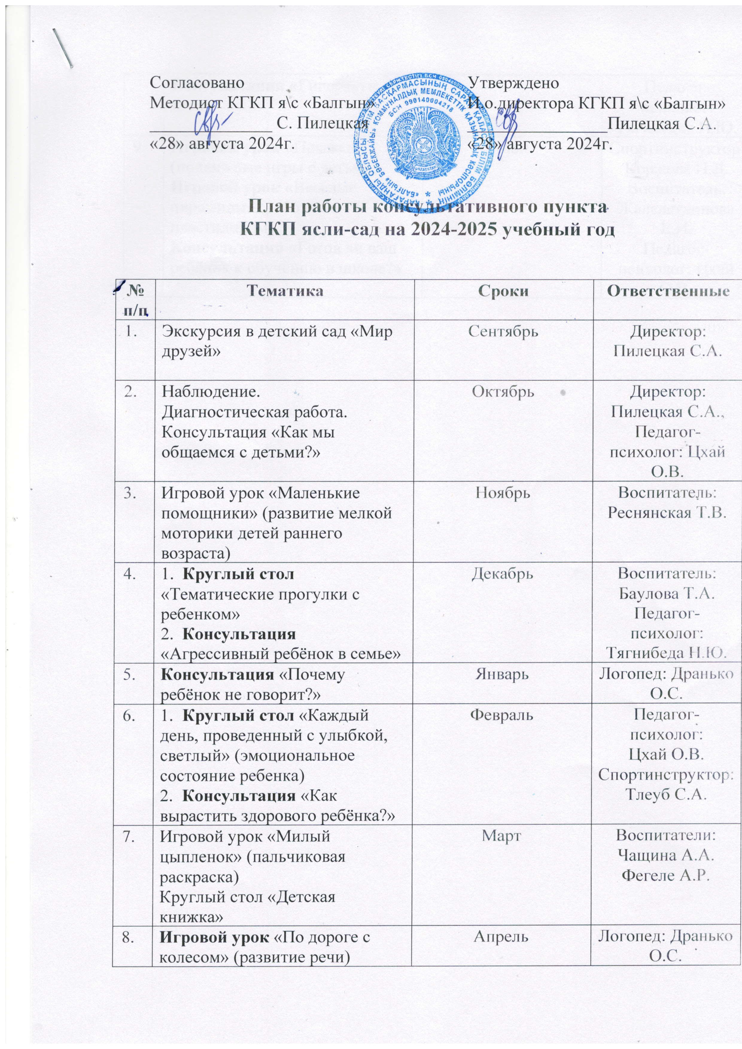 План работы консультативного пункта КГКП ясли-сад на 2024-2025 учебный год